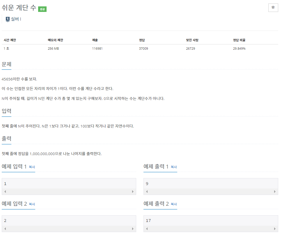 길이가 n이고 끝 숫자가 m인 계단 수는 길이가 (n-1)이고 끝 숫자가 (m-1)인 계단 수와 길이가 (n-1)이고 끝 숫자가 (m+1)인 계단 수의 합이다.(1<= m <=8)