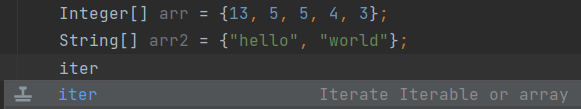 배열을 생성하고 iter을 입력하면 자동으로 반복문을 생성해준다.
