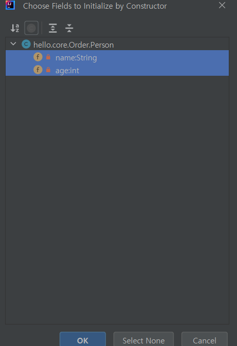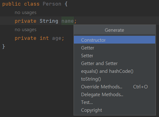 다음과 같은 Person 클래스에서 Alt+Insert 단축키를 사용해보자.