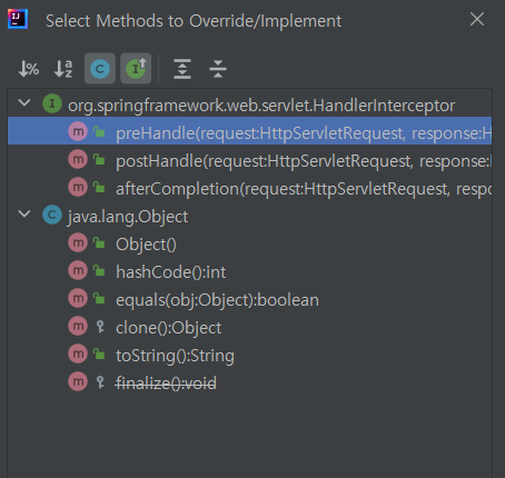 반드시 구현해야 하는 메소드들이 존재하는데 Ctrl + O 단축키를 누르면 구현해야 하는 메소드들이 나온다.