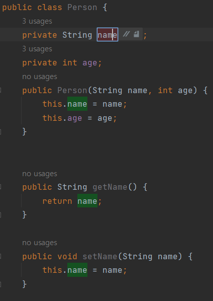 this.name = name에서 메소드의 인자로 받은 name은 선택되지 않는 것으로 보아 단순히 같은 이름을 모두 선택하는 것이 아니다.