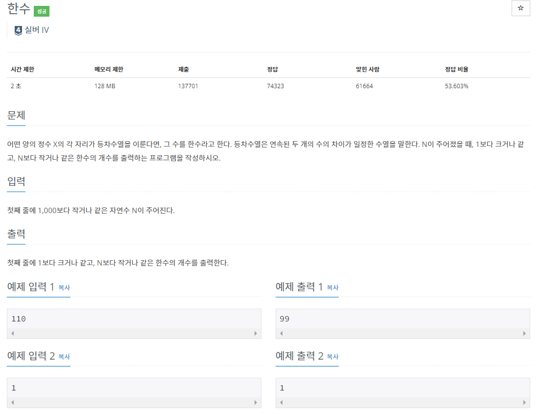 어떤 양의 정수 X의 각 자리가 등차수열을 이룬다면, 그 수를 한수라고 한다. 등차수열은 연속된 두 개의 수의 차이가 일정한 수열을 말한다. N이 주어졌을 때, 1보다 크거나 같고, N보다 작거나