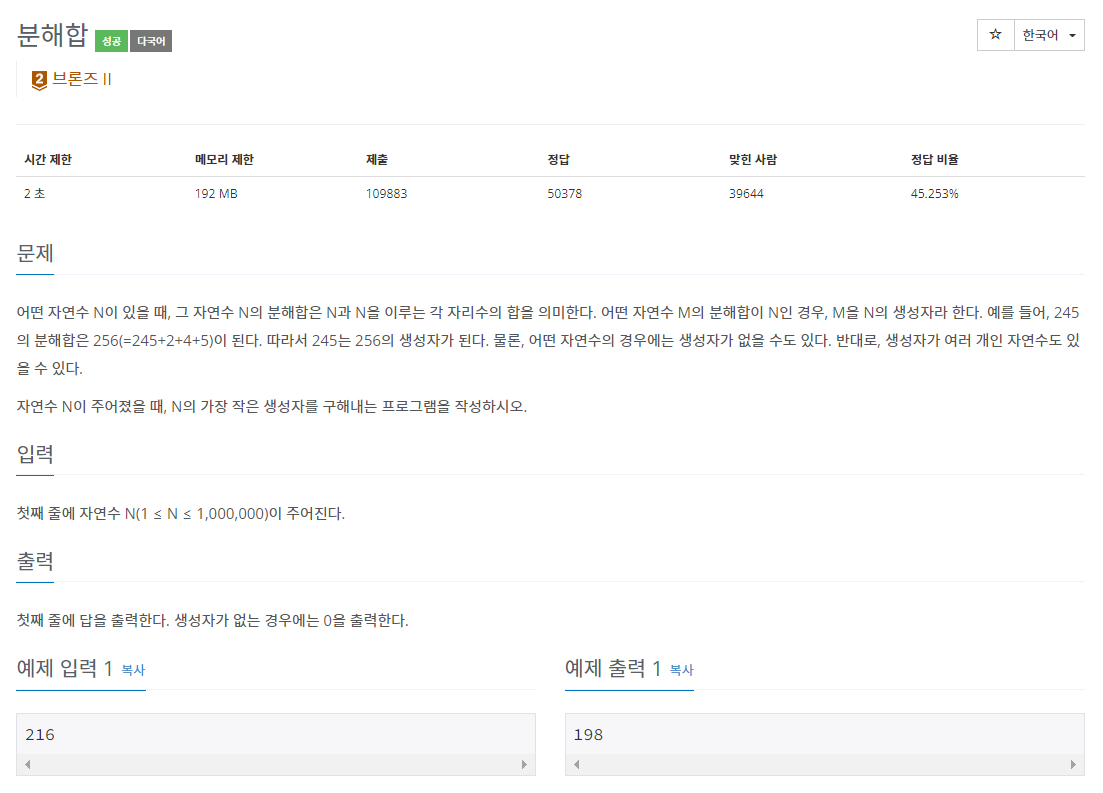 어떤 자연수 N이 있을 때, 그 자연수 N의 분해합은 N과 N을 이루는 각 자리수의 합을 의미한다. 어떤 자연수 M의 분해합이 N인 경우, M을 N의 생성자라 한다. 예를 들어, 245의 분해합은 256(=245+2+4+5)이