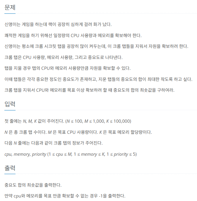 가장 기초 냅색 문제인 배낭 문제처럼 dp[i][j][k]의 값을 i번째 크롬 탭까지 고려했을 때 확보한 CPU 사용량이 j이면서 확보한 메모리 할당량이 k일 때 중요도 합의 최솟값이라고 정의하면 된다.