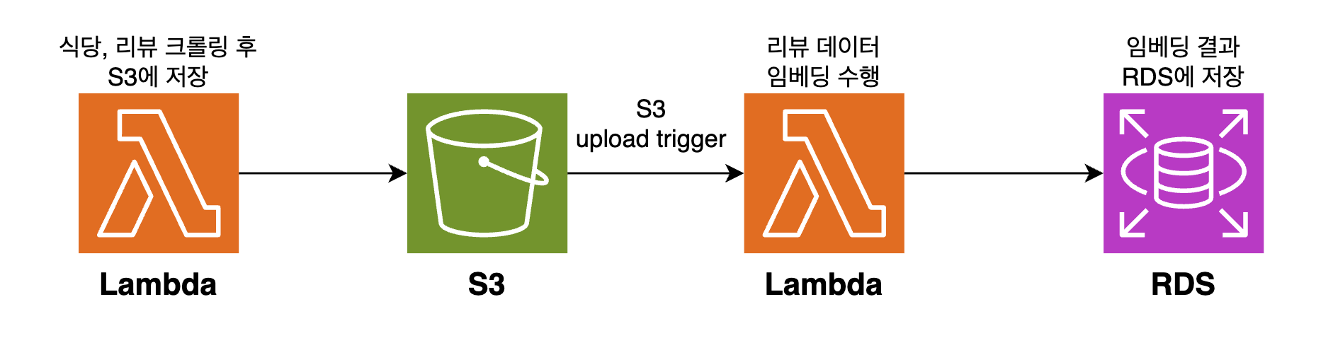 Lambda에서 크롤링 후 S3에 저장하면 trigger를 통해 Lambda에서 임베딩 후 데이터베이스에 저장하는 구조입니다.