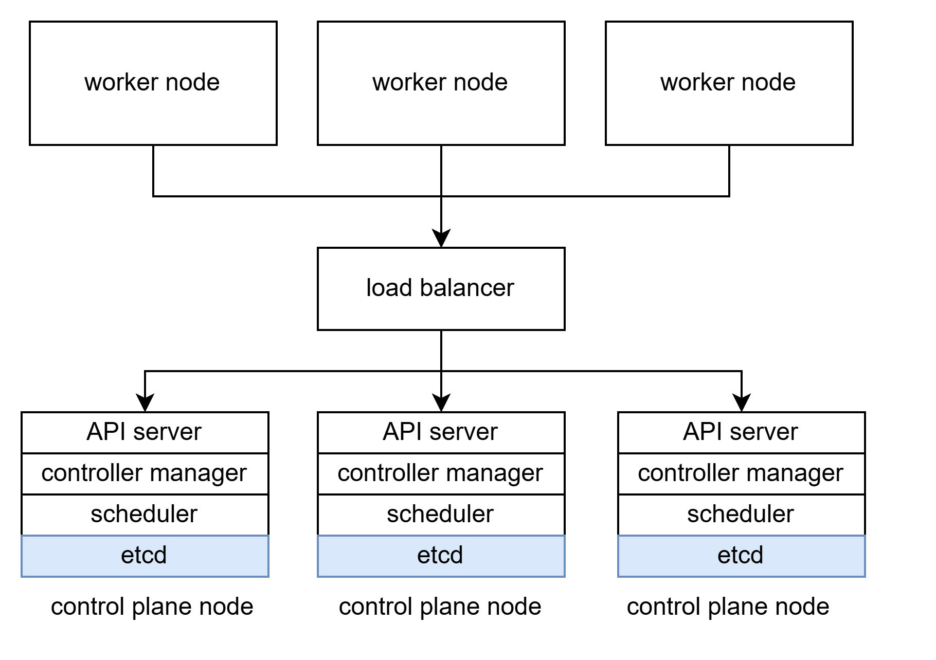 etcd가 각 control plane node 안에 존재한다면 stacked etcd topology이며 etcd cluster가 외부에 존재한다면 external etcd topology입니다.